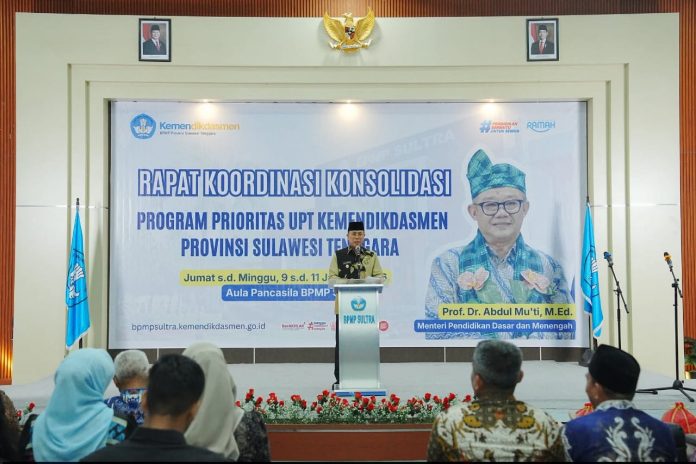 Penegasan tersebut disampaikan Gubernur Sulawesi Tenggara, Mayjen TNI (Purn.) Andi Sumangerukka (ASR), saat menerima kunjungan kerja Menteri Pendidikan Dasar dan Menengah Republik Indonesia, Prof. Dr. Abdul Mu’ti, M.Ed., dalam kegiatan Rapat Koordinasi Konsolidasi Program Prioritas UPT Kemendikdasmen yang dirangkaikan dengan Lokakarya Majelis Dikdasmen Pendidikan Nonformal dan Pengembangan Pesantren Pimpinan Wilayah Muhammadiyah Sultra di Aula Pancasila BPMP Sultra, Jumat 9 Januari 2026.